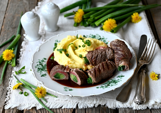 600 g daňčí kýty bez kosti (šál), 2 svazky jarních cibulek, 150 g selské šunky, medová hořčice, směs jemně mletého koření na zvěřinu, sůl; olej na pečení na omáčku: 200 ml portského, 100 ml silného zvěřinového vývaru, 3 lžíce másla, 10 g sušených hříbků, 1 malá...